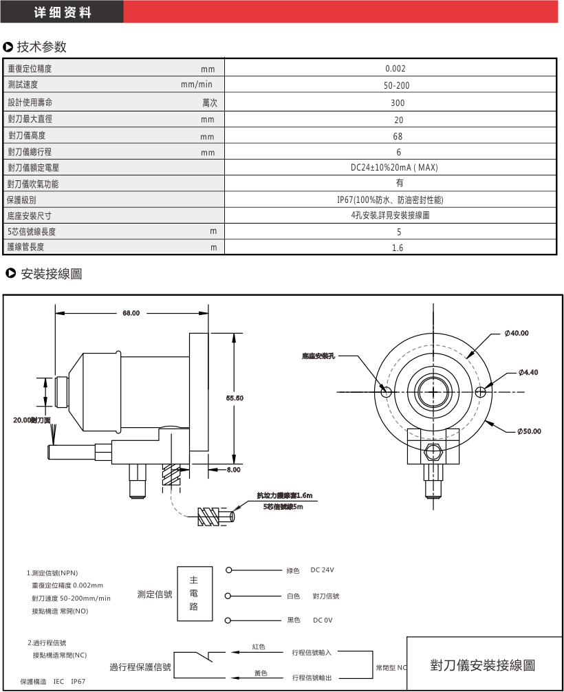 自动高效精确测量刀具长度;有效监控刀具磨损变化;及时补偿机床热变位;结构紧凑坚固耐用;安装便捷极耐磨损;国际标准化专利技术构造;实用于国内外所有控制操作系统。
